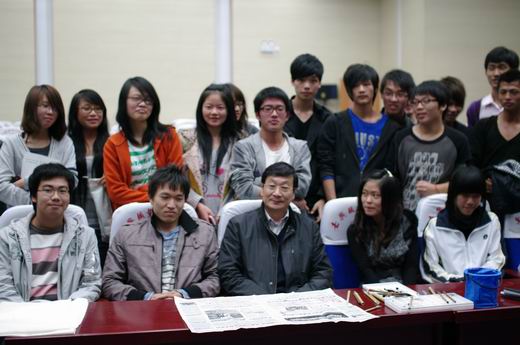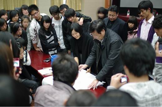 學(xué)生在開幕式上參與活動有動漫cosplay表演,禮儀服務(wù)等四項內(nèi)容。當(dāng)天下午,人民日報社《諷刺與幽默》主編、中國美術(shù)家協(xié)會漫畫藝委會主任徐鵬飛先生在四號樓109做了一場主題為《低碳環(huán)保漫畫創(chuàng)作》的講座。徐鵬飛先生還在講座現(xiàn)場親筆作了一次即興漫畫創(chuàng)作表演,極大地激發(fā)了在場同學(xué)們的觀看熱情,沒幾分鐘的時間,一副生動有趣的人物漫畫作品躍然紙上。賞畫之余,同學(xué)們個個不禁翹起了大拇指,流露出欽佩的眼神。這場講座不但讓同學(xué)們增長了動漫創(chuàng)作知識,欣賞了妙趣橫生的漫畫作品,而且還真正感受到了動漫藝術(shù)的無窮魅力。(/沈宇紅 攝/彭軼)