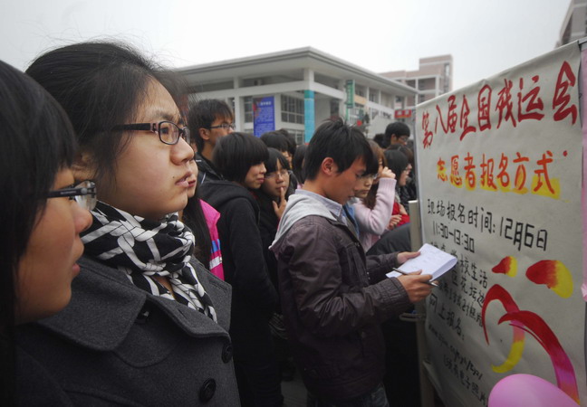 12月6日,第八屆全國殘疾人運(yùn)動(dòng)會(huì)志愿者招募活動(dòng)在嘉興職業(yè)技術(shù)學(xué)院舉行,大學(xué)生們踴躍報(bào)名。短短一個(gè)小時(shí),報(bào)名人數(shù)就達(dá)1200多人。據(jù)悉,第八屆殘運(yùn)會(huì)明年10月將在杭、湖、嘉、紹四地同時(shí)舉行。(魏煒)