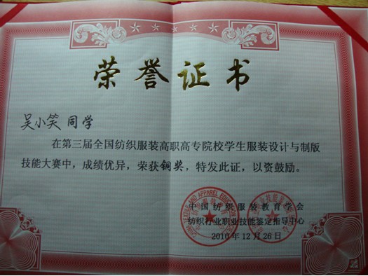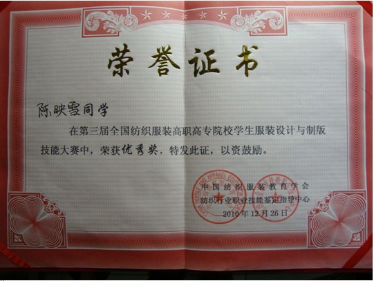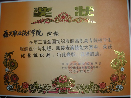 本次大賽共有來自全國26所高職高專院校的78位選手參加服裝設(shè)計與制版的比賽,經(jīng)過激烈的角逐,由陳泓、趙綺、羅曉菊三位老師指導(dǎo)的張宇婷、吳小笑、陳映雪三位同學(xué)分別榮獲銀獎、銅獎與優(yōu)秀獎。此外,我院還獲得了“團(tuán)體組織優(yōu)勝獎”獎項,為學(xué)校爭得了榮譽。(趙琦)