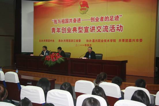 4月14日,由共青團(tuán)中央主辦、共青團(tuán)浙江省委協(xié)辦、嘉興職業(yè)技術(shù)學(xué)院和嘉興團(tuán)市委承辦的“我與祖國共奮進(jìn)——創(chuàng)業(yè)者的足跡”青年創(chuàng)業(yè)典型走進(jìn)高職院校首場報(bào)告會(huì)在我院舉行。第五屆中國 青年創(chuàng)業(yè)獎(jiǎng)獲得者、山東旗幟軟件股份有限公司董事長韓烽,第六屆中國青年創(chuàng)業(yè)獎(jiǎng)獲得者、溫州市維日康生物科技有限公司董事長王賢俊以及我院大學(xué)生代表等300余人參加了本次活動(dòng)。