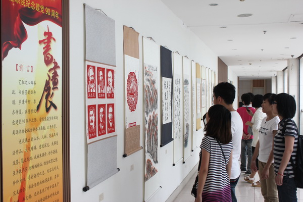 揮筆頌立黨為公、執(zhí)政為民,蘸墨繪紅船星火傳、揮師長征路。濃墨中,偉人音容笑貌活靈活現(xiàn);重彩下,祖國錦繡河山美麗輝煌。在全校師生以各種形式喜迎建黨90周年的日子里,由學院黨委宣傳部與離退休協(xié)會聯(lián)合舉辦的紀念建黨90周年書畫展在圖書館四樓門廳拉開帷幕。