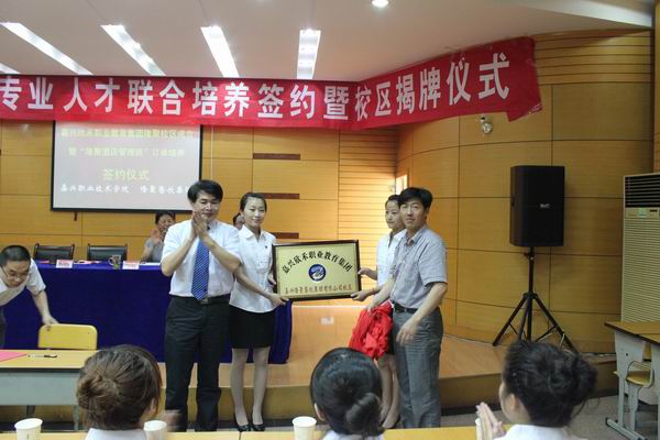 沈建根副院長和盛富林總裁簽署共建嘉興市欣禾職業(yè)教育集團聚餐飲集團有限公司校區(qū)協(xié)議,并同學(xué)生代表一起簽署酒店管理專業(yè)聯(lián)合培養(yǎng)人才的三方合作協(xié)議,隨后他與盛富林總裁為欣禾職業(yè)教育集團隆聚餐飲集團有限公司校區(qū)揭牌。