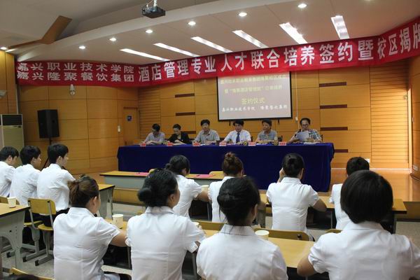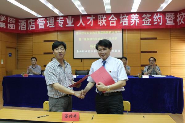 6月12日下午,在金悅王朝大酒店培訓(xùn)中心內(nèi),學(xué)院與嘉興隆聚餐飲集團簽約共建欣禾職業(yè)教育集團隆聚餐飲集團有限公司校區(qū),2011級酒店管理專業(yè)人才聯(lián)合培養(yǎng)簽約儀式同時舉行。欣禾職教集團副理事長、隆聚餐飲集團總裁盛富林、集團公司人力資源部總經(jīng)理蔡荔華、職教集團秘書長、學(xué)院副院長沈建根和外語與貿(mào)易分院黨總支書記、副院長姚寧屏出席簽約儀式。儀式由外語與貿(mào)易分院副院長王家慶主持。
