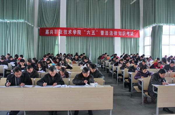 12月19日下午,我院認(rèn)真組織全院教職員工參加了嘉興市2012年度“六五”普法考試。本次考試分設(shè)兩個(gè)考場,學(xué)院應(yīng)參加人數(shù)為418人,實(shí)際參加人數(shù)為403人,15人因公請假,在校的學(xué)院領(lǐng)導(dǎo)全部參加了考試??紙錾?,參考者凝神沉思,認(rèn)真審題,仔細(xì)答卷,考場秩序井然,所有參考人員都順利完成了考試。