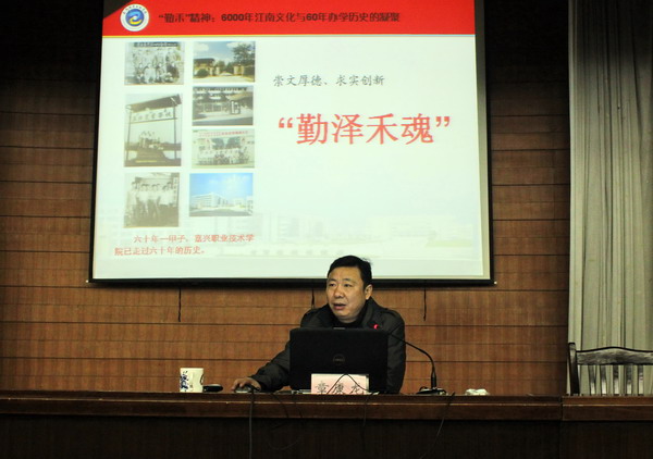 講座從“勤澤禾魂”----江南文化教育傳承的人文特征,“勤澤禾魂”——嘉職院辦學(xué)六十年的生動實踐,“勤禾”精神的內(nèi)涵,進一步培育和弘揚“勤禾”精神四個方面展開。通過詳實的史料分析,言簡意賅的精辟闡述,章康龍副院長將6000年江南文化的靈韻娓娓道來,也將我院60年的辦學(xué)歷史和“勤澤禾魂”的校園文化精神進行了充分展示和深入解讀。他指出,要進一步培育和弘揚“勤禾”精神,就是要發(fā)揚“愛崗敬業(yè)、腳踏實地”的職業(yè)精神,“艱苦奮斗、真抓實干”的創(chuàng)業(yè)精神,“銳意進取、追求卓越”的創(chuàng)新精神,“知行合一、以德為先”的學(xué)習(xí)精神。