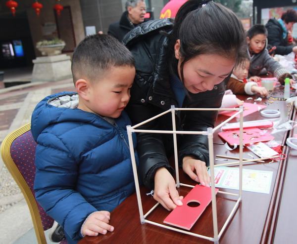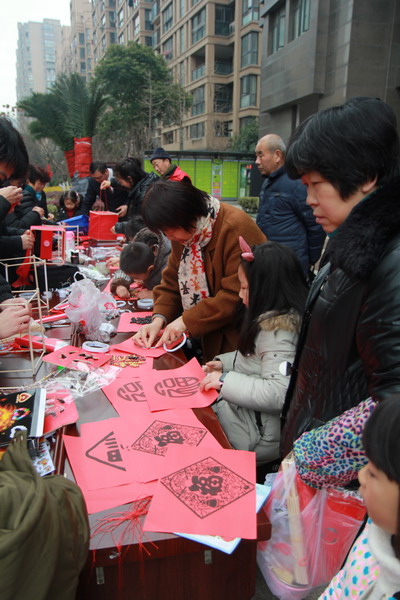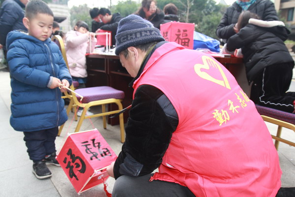 在小區(qū)物業(yè)的支持下,小區(qū)20戶家庭的家長帶領(lǐng)小朋友一同參加活動?!扒诤獭敝驹刚邆兿戎v解制作燈籠的要領(lǐng),20戶家庭一次排開,在長條桌前大手牽小手,開始了親子手工制作燈籠的活動。家長和兒童在志愿者們的示范下,或用卷筆刀削尖桿子,或用雙面膠粘牢紅布,或把鏤空的“?!弊智哆M去,再用桿子將燈籠挑起來,然后由鴛湖詩社的高賢老師揮毫潑墨,在燈籠的四面用毛筆書寫各種不同字體的“福”字。整個過程構(gòu)思新穎而有趣,充滿了喜感。做完燈籠,小朋友們高興地提著大紅燈籠四處“曬”寶,樂得合不攏嘴。