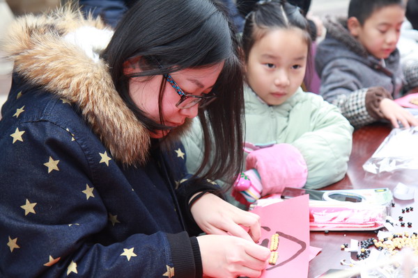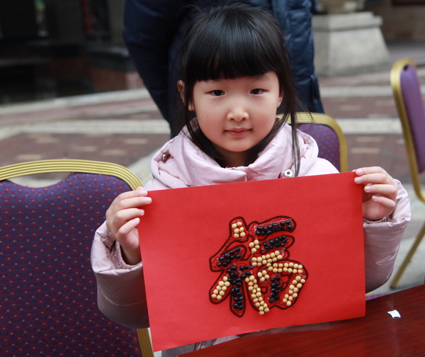 隨后,志愿者們又組織小朋友們將赤小豆、綠豆、黃豆、黑豆,在打印好的卡紙上用雙面膠進行粘貼,由五顏六色的豆豆貼成的一個個“福”字.整個過程,家長和小朋友們齊動手,吸引了不少小區(qū)居民前來參與,場面好不熱鬧。