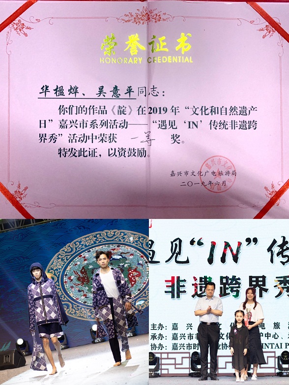2019年6月8日晚上由嘉興市文化廣電旅游局主辦,嘉興市非物質文化遺產(chǎn)保護中心承辦的2019“文化和自然遺產(chǎn)日”嘉興市系列活動:遇見“IN”傳統(tǒng)非遺跨界秀服裝設計比賽中,我校服裝與服飾設計專業(yè)學生在老師的指導下,通過近半個月的努力,設計并制作了有關于藍印花布、灶頭畫、土布、皮影戲、扎染等非遺元素的系列服裝。最終華楹燁、吳意平同學獲得本次比賽唯一的一項一等獎,鐘江妍獲得二等獎,王崢、胡鈺彬均獲得三等獎。服裝專業(yè)學子的優(yōu)異表現(xiàn)得到大賽組委會的高度評價。