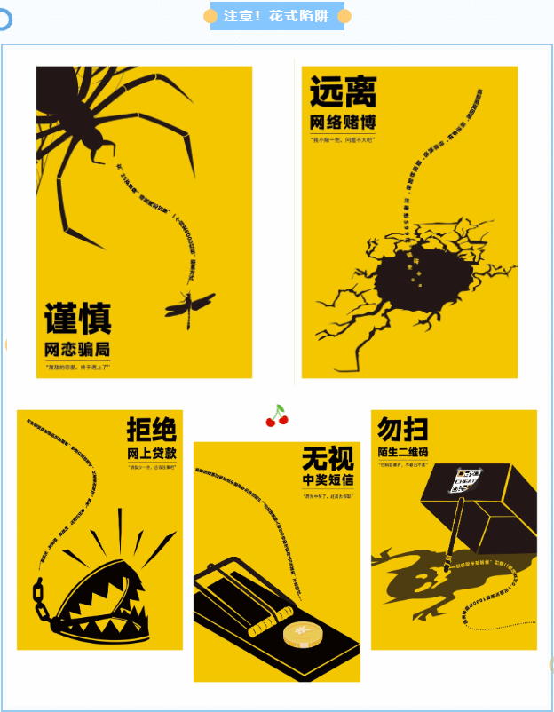 嘉職師生充分發(fā)揮師資、專業(yè)、技術(shù)等方面優(yōu)勢,以獨特的創(chuàng)意、新穎的表現(xiàn)手法,設(shè)計了一系列多媒體作品,贏得了專家的一致好評。時尚設(shè)計學院沈俊暉、尹毅鋒、周卓團隊設(shè)計的《詐騙邊緣》獲高職海報組一等獎,時尚設(shè)計學院尹毅鋒、王永杰、吳桐團隊設(shè)計的《這你都信》和王永杰、尹毅鋒、沈俊暉團隊設(shè)計的《變臉》分別獲得高職海報組二等獎;互聯(lián)網(wǎng)學院、網(wǎng)絡(luò)空間安全學院丁夢媛、程思涵、江斌團隊設(shè)計的《注意!花式陷阱》獲得高職海報組三等獎,湯玉婕、朱栩凱、吳銘威、顧詩琰團隊設(shè)計的《一生無詐》高職交互式課件組三等獎。