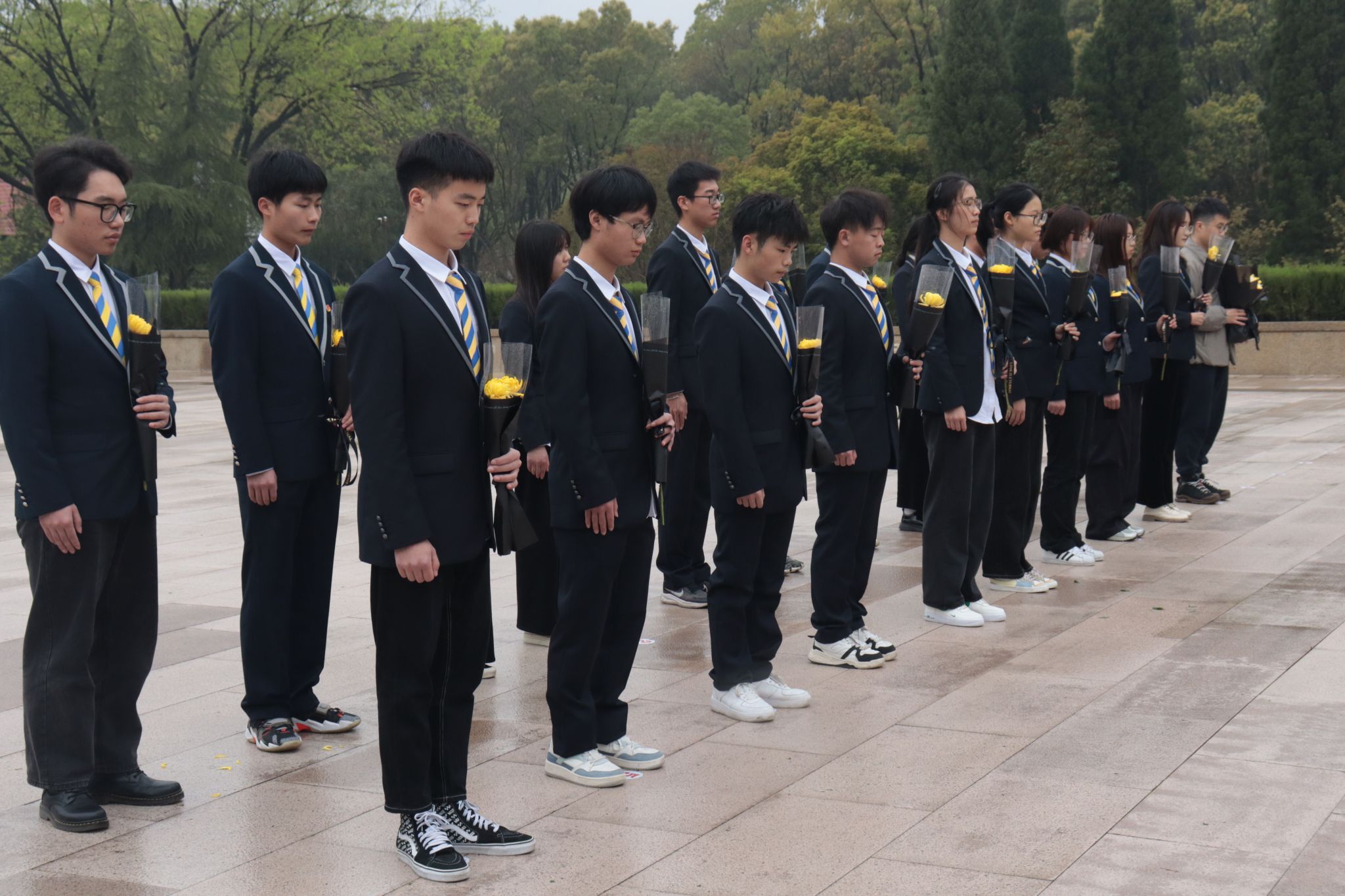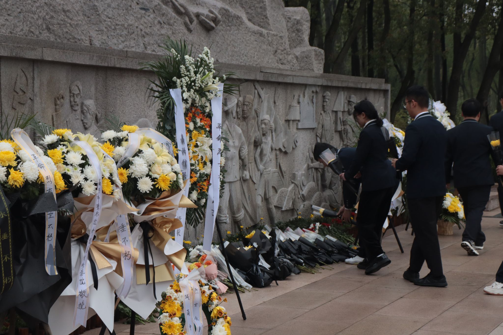 以史串人、以人彰史,傾聽完震撼人心的先烈事跡,全體人員懷著虔誠的心圍著紀(jì)念碑繞一圈,向長眠于地下的先烈們默哀一分鐘,獻(xiàn)上美麗的鮮花,表達(dá)對他們的哀思和崇高的敬意。
