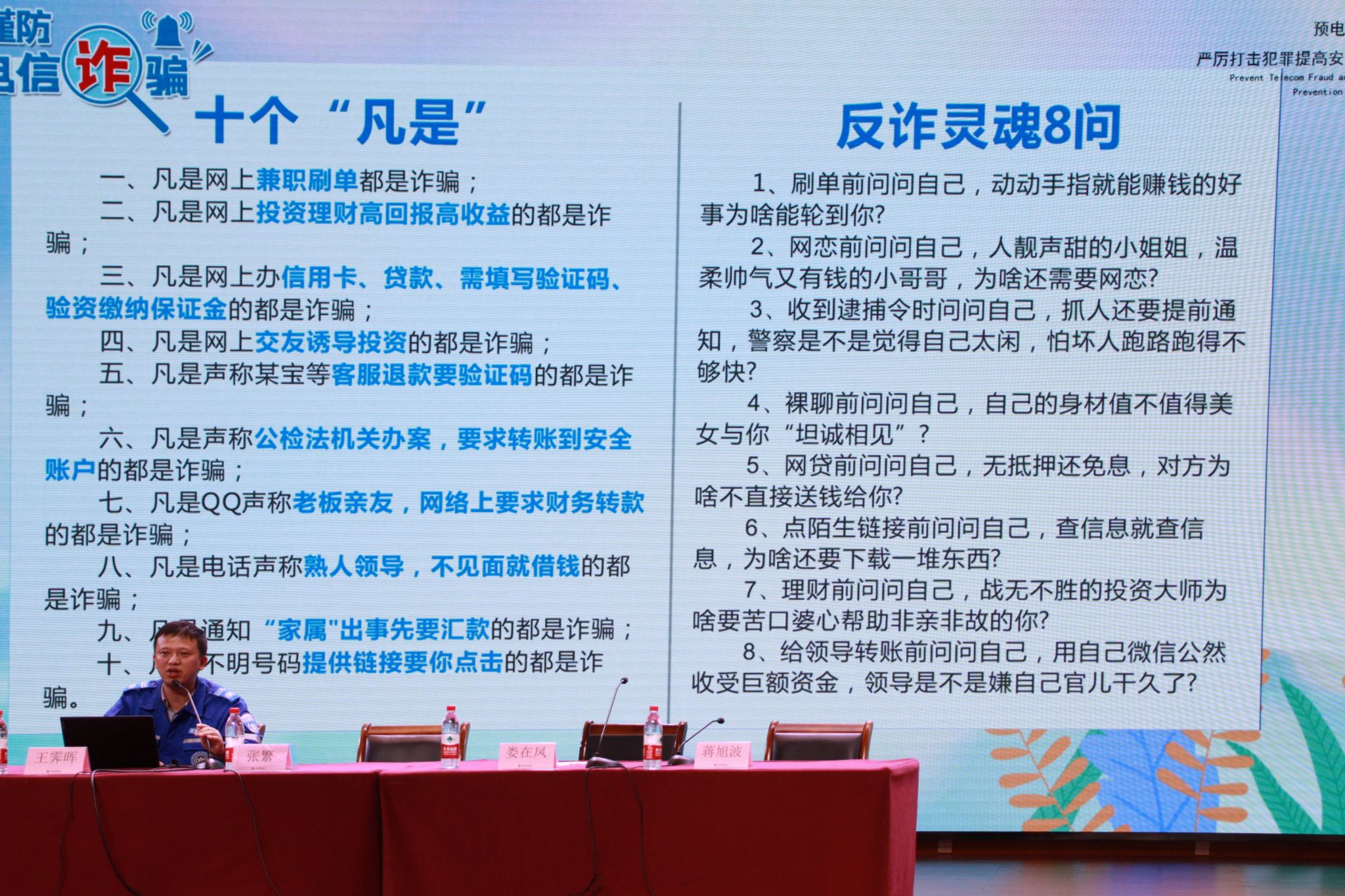 張繁以生動的案例向同學們展示了詐騙手段和方式,詳細講解了電信詐騙的幾種常見形式和防范的具體措施。他強調(diào),同學們要保持警惕,不聽、不信、不轉(zhuǎn)賬,捂緊錢袋子。王霽暉詳細介紹了有關(guān)刷單詐騙、網(wǎng)絡購物詐騙、公檢法詐騙的實際案例,深入淺出地向同學們講解了防范電信詐騙的實用知識,讓大家深入了解防范方法,增強自我防范意識。