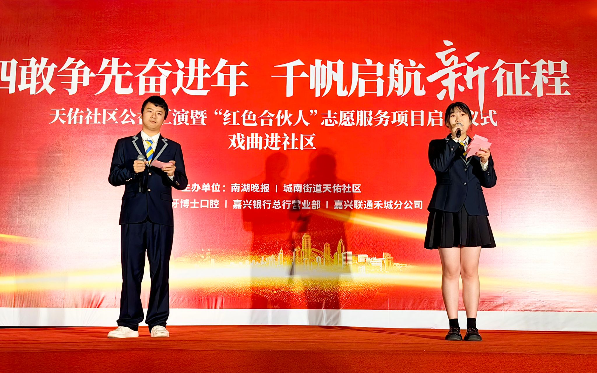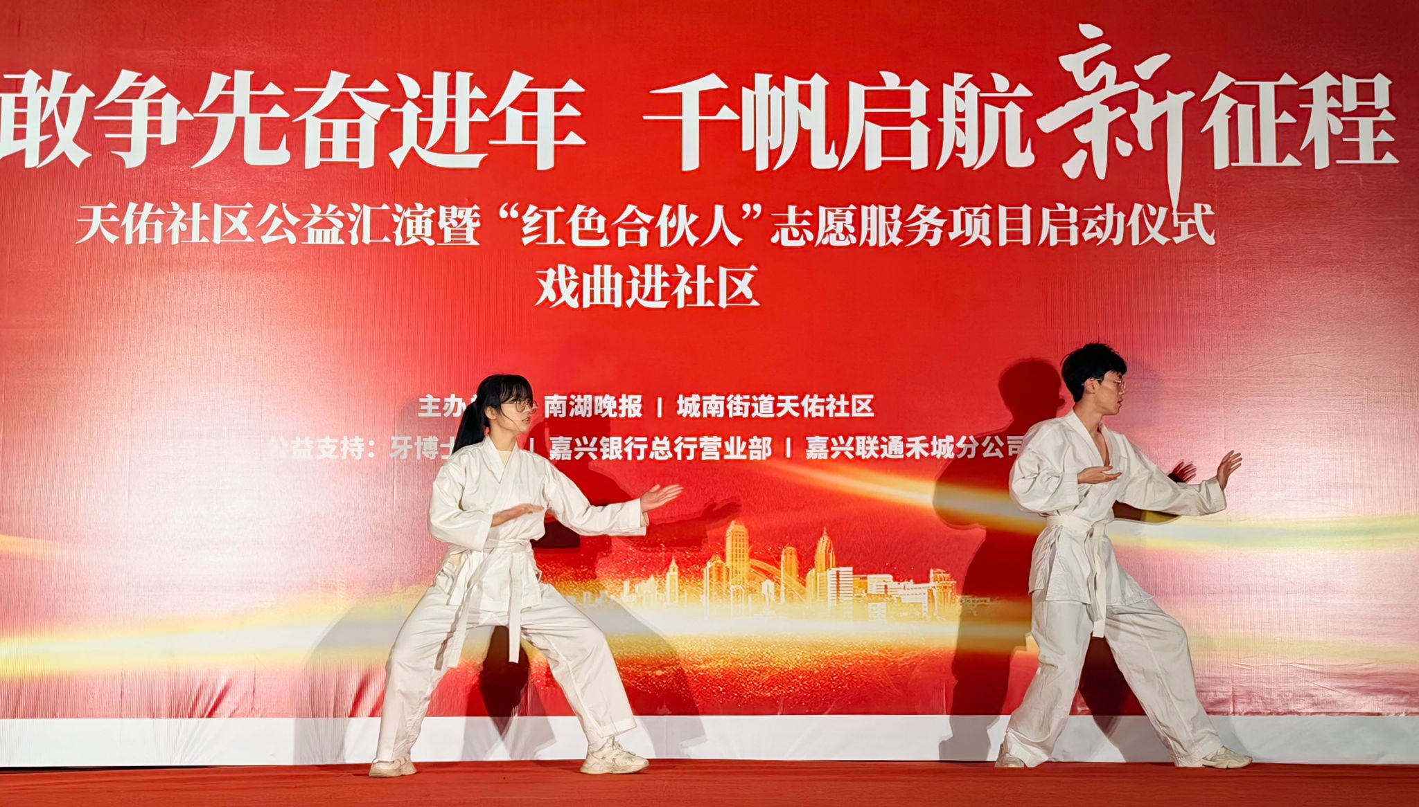 紅船青馬營(yíng)大學(xué)生志愿者不僅積極參與嘉興市公共文化品牌建設(shè),還積極參加社區(qū)文化活動(dòng)。前不久,紅船青馬營(yíng)4名大學(xué)生志愿者在嘉興市經(jīng)開區(qū)天佑社區(qū)黨群服務(wù)中心“四敢爭(zhēng)先”文藝晚會(huì)上亮相,帶來詩歌朗誦、空手道等精彩表演,贏得了社區(qū)工作人員和市民的一致稱贊。