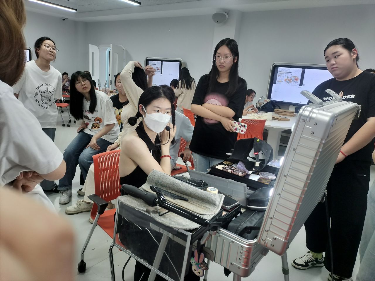 在實操練習階段,丹妮老師進行一對一指導,同學們在練習的過程中遇到問題都積極主動向老師請教,老師也非常耐心地親自示范,幫助同學們用化妝技術遮蓋住面容上的一些不足,讓大家都變得更加漂亮、更加自信。
