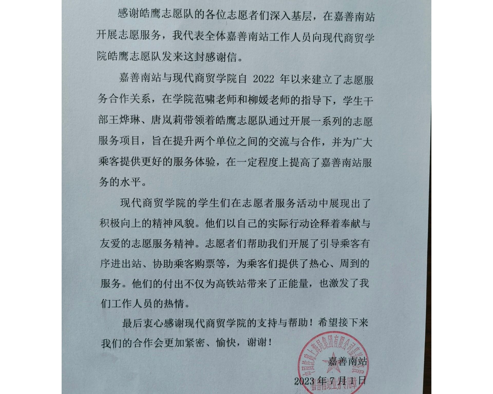 近日,嘉善南站向嘉興職業(yè)技術學院發(fā)來一封感謝信,對嘉職青年志愿者們給予高度肯定和表揚,并對學校培育出一大批“甘于奉獻、勇于擔當”的青年學生表示衷心感謝。