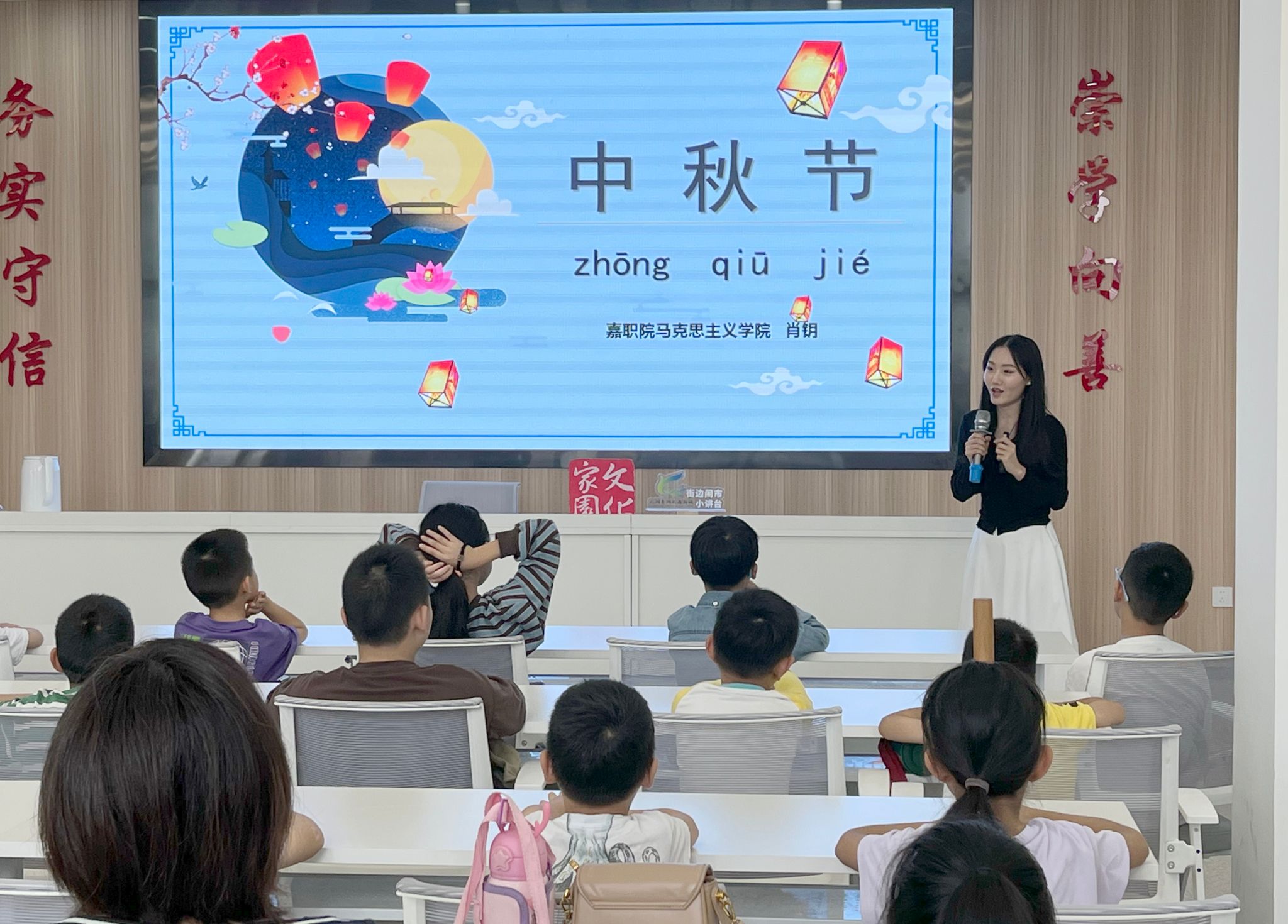 嘉職院馬克思主義學(xué)院專任教師肖鑰從中秋節(jié)的來歷、中秋小故事、中秋節(jié)傳統(tǒng)三個方面向小朋友講解了關(guān)于中秋節(jié)的相關(guān)知識,帶領(lǐng)小朋友了解中秋節(jié)的來歷、神話傳說、神話故事。課堂上還開展了知識競答活動,小朋友們舉手搶答,現(xiàn)場氣氛熱烈。