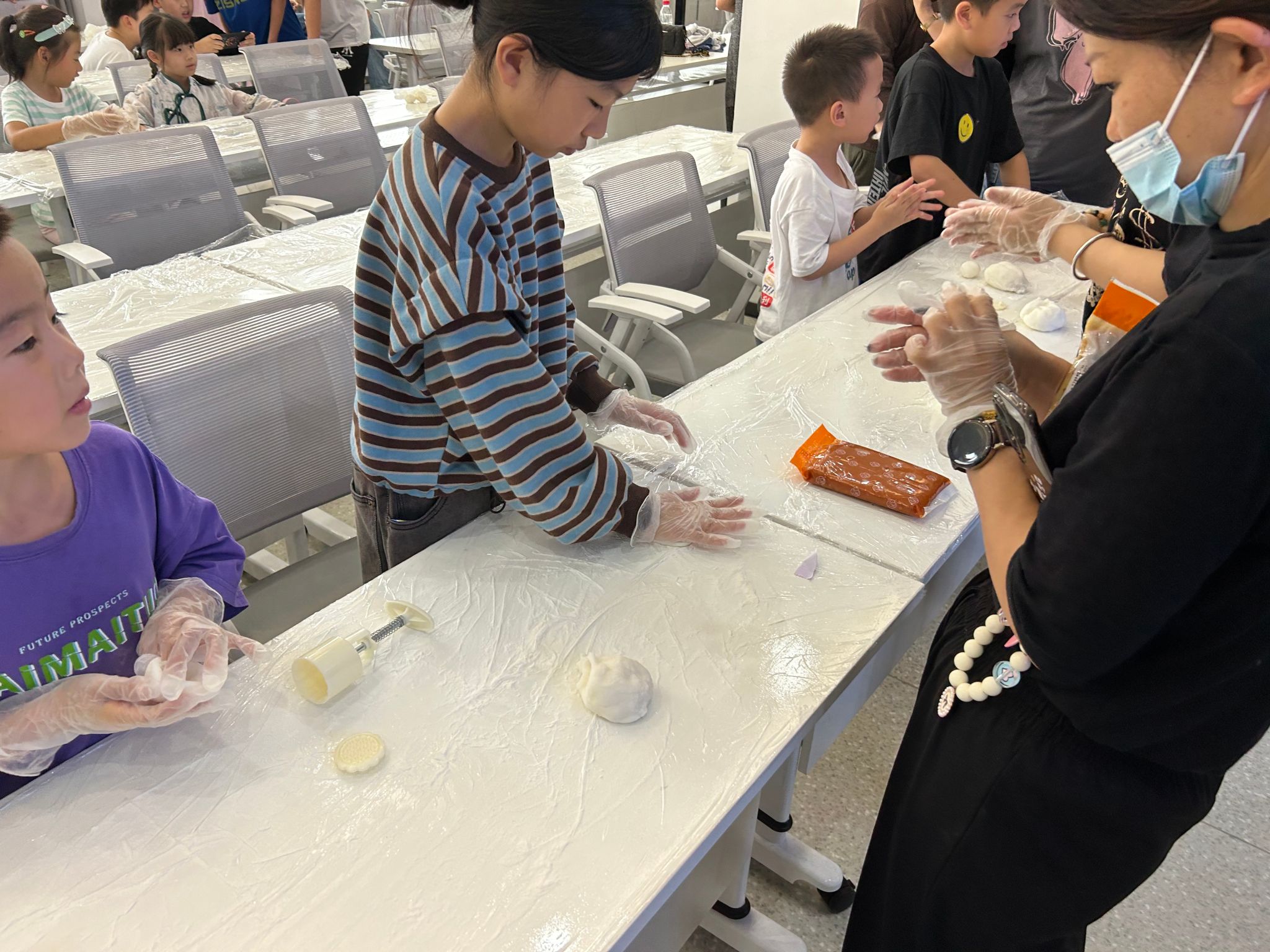 和面、包餡、裝盒……大家忙的不亦樂乎!看著一個個玲瓏小巧的冰皮月餅在自己的手中鮮活出爐,小朋友們興奮極了。一個小朋友高興地說:“今天我們一起聽肖老師上課,一起合作手制冰月餅,太開心啦!”