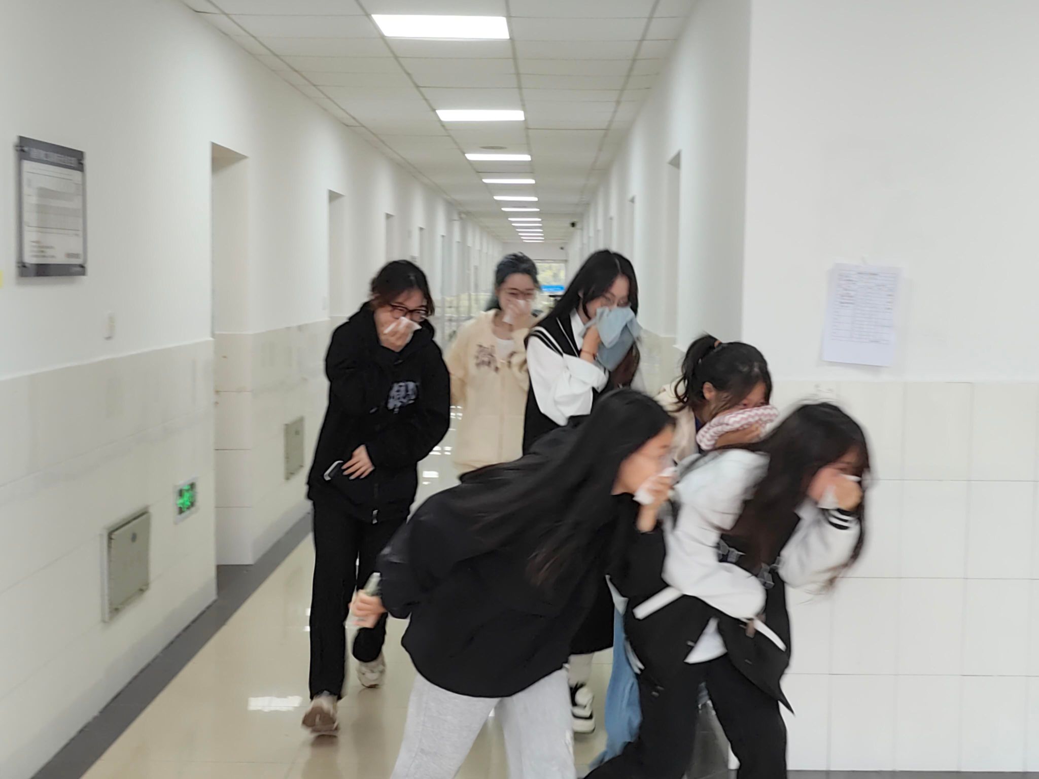 在火災(zāi)逃生演練中,學(xué)院公寓自治委員會(huì)和安全自律委員會(huì)成員引導(dǎo)學(xué)生們快速疏散。隨著警報(bào)聲響起,同學(xué)們捂住口鼻,彎腰沿安全通道科學(xué)、安全、有序、快速地撤離到安全地帶。