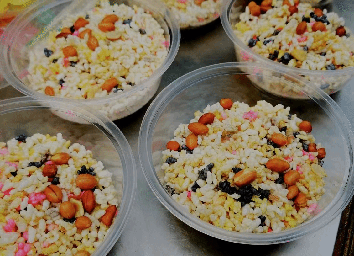 在除夕夜,我們侗族人家家戶戶都要喝上一碗“油茶”,“油茶”是侗族的傳統(tǒng)美食,承載著侗族人民的情感和文化記憶。油茶的制作流程非常講究,要先將糯米蒸成飯,陰干備用,再將陰米放進(jìn)燒沸的茶油鍋內(nèi),炸成香酥爽脆的米花。然后再在鍋里放入少許茶油,將茶葉放進(jìn)鍋里翻炒片刻,加水煮開,過濾之后即成茶水。最后加入蔥花、油果、花生等佐料,配上豬肝、粉腸、瘦肉等配菜,色香味俱全的可口油茶就做好了。對于在外求學(xué)的我來說,一碗熱氣騰騰的油茶,便是家鄉(xiāng)的味道。