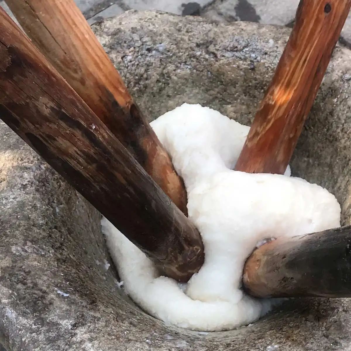 打糍粑,是我們苗族人過年的傳統(tǒng)習(xí)俗。每到年關(guān),鄉(xiāng)里每家每戶都會響起此起彼伏的快樂“打糍粑協(xié)奏曲”。打糍粑是個技術(shù)活,更是體力活,糍粑得趁熱打,講究快、準(zhǔn)、穩(wěn)、狠,糯米經(jīng)過反復(fù)捶打,很快會變得綿軟柔韌、香味四溢,這樣打出的糍粑才均勻瓷實(shí)、有韌性。通過一捏一擠,圓滾滾的糍粑就做好了,配合著香噴噴的甜、咸兩種口味的豆面粉子、驢打滾,就可以送入嘴里。糍粑黏結(jié)成團(tuán)喻示著全家和睦團(tuán)結(jié),糍粑的香甜喻示著生活甜蜜幸福,糍粑所帶來的不只是味蕾上的享受,更是人們內(nèi)心里對家鄉(xiāng)和親人的深情寄托。