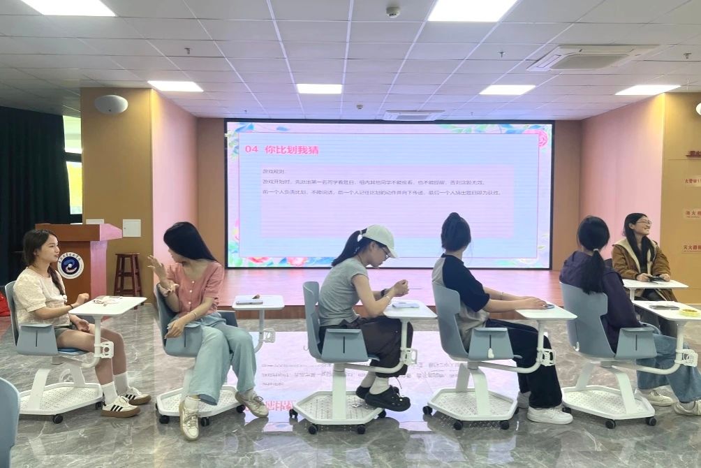 游戲環(huán)節(jié),學(xué)生們通過抽簽隨機(jī)組成五人小組,開啟“各位好漢請抱拳”“看眼色報(bào)數(shù)”“你比劃我猜”等一系列團(tuán)隊(duì)游戲,大家在游戲中釋放了壓力,在互助中懂得了團(tuán)隊(duì)協(xié)作的重要性。