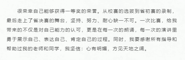 一等獎指導教師唐惠華說:“開展中華經(jīng)典誦讀競賽,不僅可以給師生提供一個了解中國傳統(tǒng)文化、繼承民族智慧的平臺,也豐富了我們的校園文化生活。這些經(jīng)典是我們民族文化的典范,是人類的共同財富,是啟迪一代又一代人的中華智慧、豐富我們情感世界的精神源泉?!?/span>