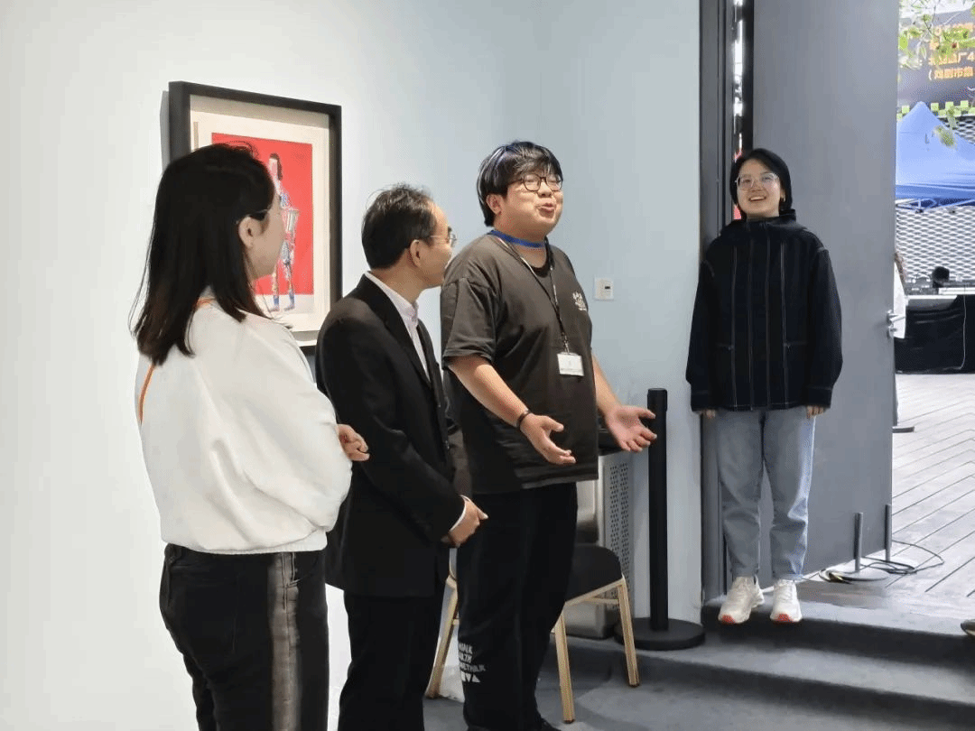 在烏鎮(zhèn)北柵絲廠五號館,嘉職志愿者負責維護場內秩序、熱情地與游人分享介紹,面對藝術品相關提問,對答如流并提出自己的思考以及見解。