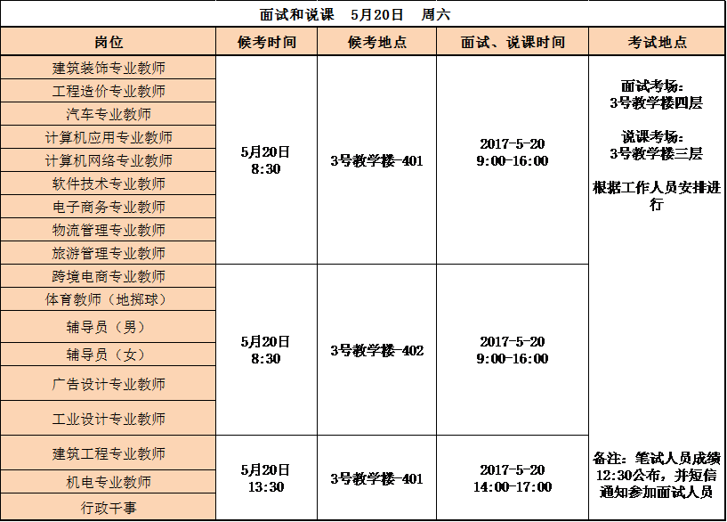 備注:面試和說課分組同時(shí)進(jìn)行?,F(xiàn)場(chǎng)根據(jù)抽簽和工作人員的安排進(jìn)行。請(qǐng)持準(zhǔn)考證和身份證入場(chǎng)。遲到半小時(shí),視為放棄考試。