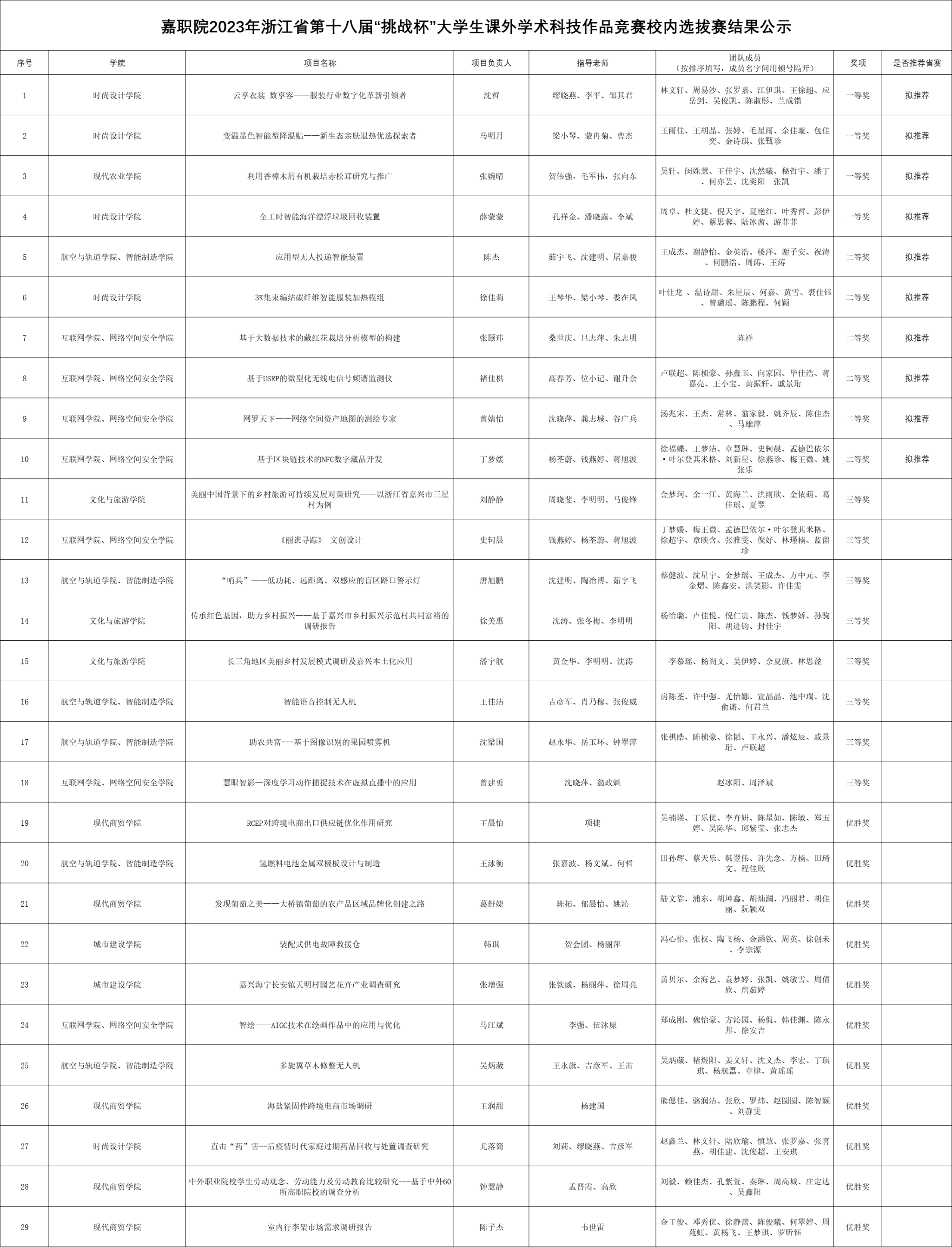 根據(jù)嘉職院團〔2023〕6號《關(guān)于組織開展浙江省第十八屆“挑戰(zhàn)杯”大學生課外學術(shù)科技作品競賽校賽的通知》,經(jīng)校賽組織專家評審,共評選出一等獎4項,二等獎6項,三等獎8項,優(yōu)勝獎11項。其中,校賽前十名擬推薦報送省賽,現(xiàn)予以公示。公示期為2023年3月31日——2023年4月5日,如有疑問或異議,請及時與校團委聯(lián)系,聯(lián)系電話:0573-89978162。
