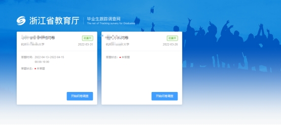 驗(yàn)證通過后,系統(tǒng)自動(dòng)進(jìn)入問卷列表頁面,因可能存在多個(gè)高校畢業(yè)生在該用人單位就業(yè),所以需回答多份關(guān)聯(lián)不同高校的問卷,非收集中狀態(tài)的問卷不可答卷。如圖: