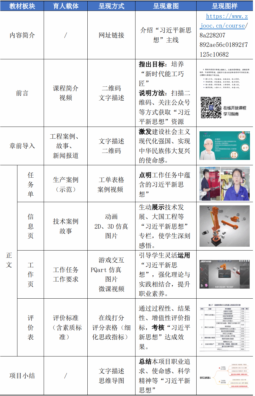 以工業(yè)機器人專業(yè)知識為落腳點,從“十個明確”、“十四個堅持”、“十三個方面成就”等核心內容體系中,提煉出與本專業(yè)高度吻合的“民族精神、創(chuàng)新精神、工匠精神、奉獻精神、工程倫理”五大思政要素。