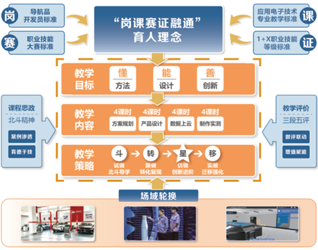 《智能電子產(chǎn)品設(shè)計與制作》課程融合“崗課賽證”育人理念,確定“懂方法、能設(shè)計、善創(chuàng)新”的教學(xué)目標(biāo);運用北斗、5G等新技術(shù)及數(shù)字化教學(xué)資源,基于電子產(chǎn)品設(shè)計全流程,構(gòu)建從“方案規(guī)劃”到“制作實測”的教學(xué)內(nèi)容;實施“場域輪換、斗轉(zhuǎn)星移”的教學(xué)策略;利用在線學(xué)習(xí)平臺、學(xué)習(xí)歷程管控平臺等開展“做評聯(lián)動、增值賦能”教學(xué)評價;通過“案例滲透、寓德于技”方法全面融入“北斗精神”,培養(yǎng)高素質(zhì)技術(shù)技能人才。
