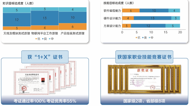 學(xué)生掌握了電子產(chǎn)品設(shè)計的流程,產(chǎn)品規(guī)劃和軟硬件設(shè)計能力顯著增強,有15%的學(xué)生該項目能力考核總評成績優(yōu)秀,該班學(xué)生在智能硬件應(yīng)用開發(fā)X證書考試中通過率達(dá)100%,優(yōu)秀率55%。在省部級及以上職業(yè)技能競賽“電子產(chǎn)品設(shè)計及制作、電子產(chǎn)品芯片級維修與數(shù)據(jù)恢復(fù)”等賽項中表現(xiàn)優(yōu)異,獲國家級技能競賽獎項2項,省部級技能競賽獎項8項。