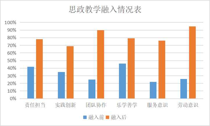 通過(guò)融入課程思政元素于教學(xué)手段中后,課程團(tuán)隊(duì)從責(zé)任擔(dān)當(dāng)、實(shí)踐創(chuàng)新、團(tuán)隊(duì)協(xié)作、樂(lè)學(xué)善學(xué)、服務(wù)意識(shí)、勞動(dòng)意識(shí)六個(gè)方面分別對(duì)學(xué)生進(jìn)行了考察。根據(jù)課前組織的案例視頻搜集,課中的生生評(píng)價(jià)、師生評(píng)價(jià)、企業(yè)導(dǎo)師評(píng)價(jià)以及課后的問(wèn)卷星測(cè)試成績(jī)多方面反饋,學(xué)生的各方面素質(zhì)及技能都得到了大幅度的提高。其中,城軌專業(yè)的學(xué)生在勞動(dòng)意識(shí)方面提升非常明顯,課程思政元素融入前大部分學(xué)生都處于“被動(dòng)勞動(dòng)”狀態(tài),只有教師督促了才開(kāi)始進(jìn)行勞動(dòng),僅有26%學(xué)生愿意主動(dòng)參與勞動(dòng)。融入課程思政于教學(xué)中后,95%學(xué)生愿意參與主動(dòng)勞動(dòng),班級(jí)勞動(dòng)氛圍良好。學(xué)生具體提升情況如下表所示: