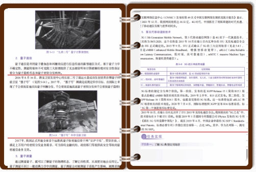 模塊五在介紹量子通信發(fā)展時(shí),重點(diǎn)介紹了“墨子號(hào)”衛(wèi)星和“京滬干線”的建成,在介紹5G通信技術(shù)時(shí),重點(diǎn)介紹我國(guó)在5G移動(dòng)通信領(lǐng)域的快速發(fā)展和卓越貢獻(xiàn),讓學(xué)生了解該技術(shù)發(fā)展現(xiàn)狀的同時(shí),啟發(fā)學(xué)生的創(chuàng)新意識(shí),點(diǎn)燃學(xué)生的愛(ài)國(guó)激情,激發(fā)學(xué)生建設(shè)數(shù)字強(qiáng)國(guó)的自信心和使命擔(dān)當(dāng)。圖4為模塊五“信息新技術(shù)”部分節(jié)選。