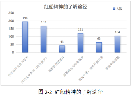 針對(duì)紅船精神的了解途徑這個(gè)維度分析,通過(guò)學(xué)校宣傳及課本學(xué)習(xí)有194人,通過(guò)網(wǎng)絡(luò)文章新聞(微信推文)有167人,通過(guò)觀看影視紀(jì)錄片有43人,通過(guò)展板報(bào)紙等實(shí)物媒介有121人,通過(guò)親友口述、長(zhǎng)輩耳濡目染有63人,通過(guò)參觀革命遺址有104人,如圖2-2所示。