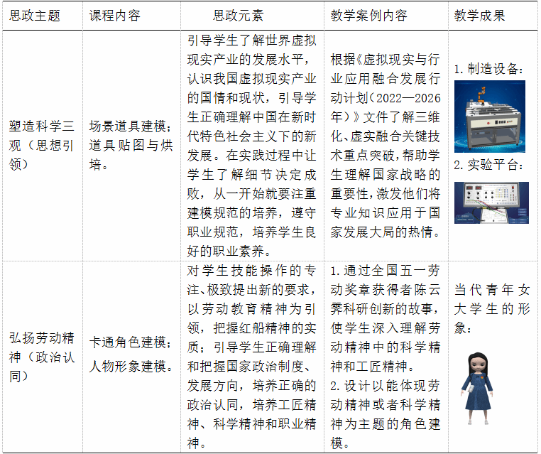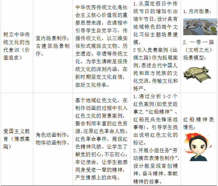 習近平總書記在黨的二十大報告中提出,我們需要不斷發(fā)展馬克思主義,但這不能脫離中國的具體國情和深厚的傳統(tǒng)文化。他強調(diào)了“兩個結合”的重要性:一是與中國的具體情況相結合,二是與中華優(yōu)秀傳統(tǒng)文化相結合。這意味著我們應該從歷史和現(xiàn)實、理論和實踐的角度來認識和運用中華優(yōu)秀傳統(tǒng)文化?!度S建模和動畫》課程依據(jù)虛擬現(xiàn)實技術應用專業(yè)工作任務與職業(yè)能力分析中的“虛擬現(xiàn)實模型設計與制作”工作項目設置,實現(xiàn)突出對學生職業(yè)能力的訓練。但是,如果教師只能傳授知識,而忽視了思政內(nèi)容,那么“教書育人”只完成了一半,如果育人沒有做好,那么教書也就失去了意義,兩者相輔相成。因此,與中國的具體實際相結合,與中華傳統(tǒng)文化相結合,充分利用專業(yè)課程的教育功能,運用學科思維中的德育元素,從專業(yè)課程中提取出潛藏的價值觀和信念體系,以此體現(xiàn)教學與人格培養(yǎng)的緊密結合具有一定的意義。