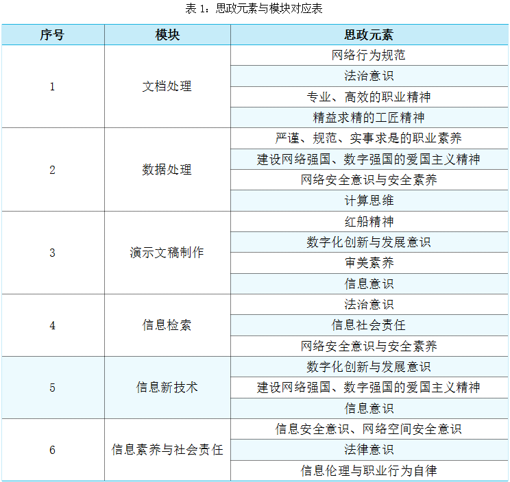 深入分析教材思政育人目標(biāo),從“行為規(guī)范、職業(yè)素養(yǎng)、信息素養(yǎng)、思維模式、意志品質(zhì)、理想信念”六個(gè)層面深挖專業(yè)知識(shí)內(nèi)容中的思政點(diǎn),將這些思政元素落實(shí)到教材的六大模塊中。各模塊與思政元素的對(duì)應(yīng)關(guān)系如表1所示: