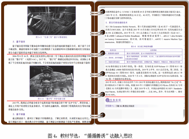 模塊五在介紹量子通信發(fā)展時(shí),重點(diǎn)介紹了“墨子號(hào)”衛(wèi)星和“京滬干線”的建成,在介紹5G通信技術(shù)時(shí),重點(diǎn)介紹我國在5G移動(dòng)通信領(lǐng)域的快速發(fā)展和卓越貢獻(xiàn),讓學(xué)生了解該技術(shù)發(fā)展現(xiàn)狀的同時(shí),啟發(fā)學(xué)生的創(chuàng)新意識(shí),點(diǎn)燃學(xué)生的愛國激情,激發(fā)學(xué)生建設(shè)數(shù)字強(qiáng)國的自信心和使命擔(dān)當(dāng)。圖4為模塊五“信息新技術(shù)”部分節(jié)選。