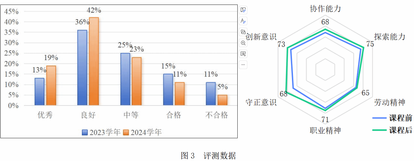 課程學習目標不僅是對專業(yè)知識的學習,更是學生綜合能力素質的提升。通過“兩個五位一體”進課程,學生在知識、技能、道德、團隊、社會意識、崗位適配度等各方面均有所提高。分析 2023 年與 2024 年學生總結性考試成績,提升效果達到 10%以上。學生課程前后評測數據如下: