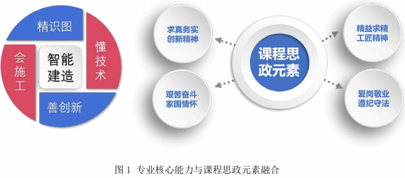 智能建造專業(yè)核心能力與課程思政元素如圖 1 所示。此外,依據“立德樹人、德育為先”的原則確定了德育目標,同時需要第一個“五位一體”作為政策導向。德育目標包括:(政治建設)培養(yǎng)學生愛國、敬業(yè)、誠信、友善的社會主義核心價值觀;(文化建設)培養(yǎng)學生的民族自豪感與文化自信;(社會建設)培養(yǎng)學生求真務實、實踐創(chuàng)新、精益求精的工匠精神;(經濟建設)培養(yǎng)學生踏實嚴謹、耐心專注、艱苦奮斗、追求卓越的優(yōu)秀品質;(生態(tài)文明建設)培育節(jié)約資源、愛護環(huán)境、實現雙碳的環(huán)保意識。擬通過概括智能建造專業(yè)的特點,充分挖掘思政元素;通過專業(yè)知識與課程思政的有機結合和相互滲透,培養(yǎng)學生的家國情懷、工匠精神、創(chuàng)新精神、愛崗敬業(yè)精神、遵紀守法意識、文化傳承意識以及良好行為習慣。