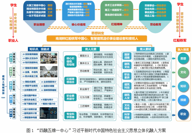 《建筑工程預(yù)算》課程為工程造價(jià)專業(yè)核心課,6學(xué)分,104課時(shí)。2021年立項(xiàng)為浙江省第一批課程思政示范課。通過產(chǎn)教融合多方協(xié)同構(gòu)建“四融五維一中心”紅船精神融入專業(yè)課程思政育人體系。立足課程預(yù)算特色,以“南湖畔紅船鐵軍中國心,智慧建筑造價(jià)事業(yè)建設(shè)者和接班人”為中心,培養(yǎng)服務(wù)本土,會識讀、懂施工、精預(yù)算、能審計(jì)的“紅船預(yù)算鐵軍”。
