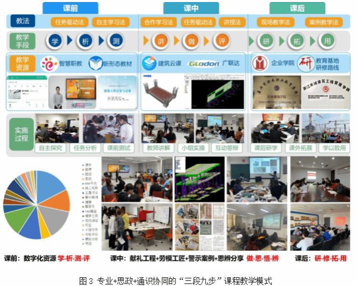 紅船精神融入專業(yè)課程教學(xué),課程團(tuán)隊(duì)是關(guān)鍵。一方面專業(yè)教師政治理論學(xué)習(xí)深度和育人元素挖掘能力有待加強(qiáng),另一方面專業(yè)課與思政課、通識課的協(xié)同不夠。思政育人既需要鹽溶于湯的潤物無聲,又需要借助信息技術(shù)用學(xué)生喜聞樂見、樂于接受的方式開展。通過思政課、通識課教師和專業(yè)課教師構(gòu)建教學(xué)團(tuán)隊(duì),充分挖掘思政元素,實(shí)施“專業(yè)課-思政課-通識課”的協(xié)同教學(xué),將紅船精神結(jié)合地方紅色基因、傳統(tǒng)文化和建筑文化等有機(jī)融入專業(yè)課程。通過“專業(yè)+思政+通識”復(fù)合型課程團(tuán)隊(duì)建設(shè),實(shí)現(xiàn)教學(xué)資源共建共享、集體備課集中研討、雙向互動課堂呼應(yīng)。專業(yè)課、思政課和通識課協(xié)同構(gòu)建“三段九步”教學(xué)模式(三段:課前、課中、課后;九步:學(xué)析測、講做評、研拓用),提升課堂協(xié)同育人水平,優(yōu)化融入效果。