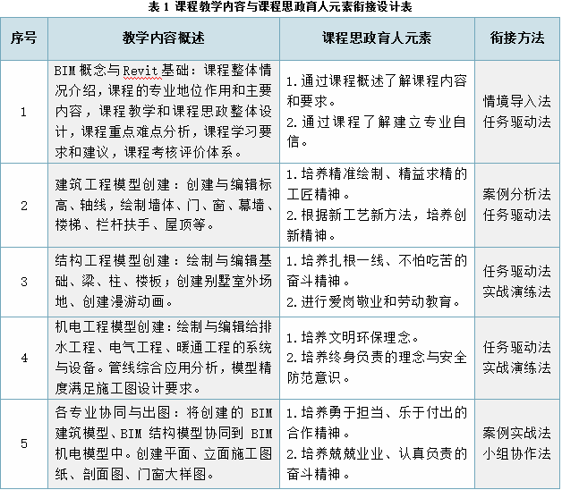 基于人才培養(yǎng)方案,以BIM行業(yè)標(biāo)準(zhǔn)為抓手,校企共建智能建造基地,實施現(xiàn)代學(xué)徒制共育高素質(zhì)工匠。以工匠精神為引領(lǐng),以實際工程圖紙為教學(xué)案例,以施工現(xiàn)場為學(xué)生實習(xí)場所,以小組為教學(xué)單元,有機(jī)融合“安全責(zé)任、守正創(chuàng)新、奮發(fā)團(tuán)結(jié)”為核心的工匠精神,培養(yǎng)專業(yè)過硬、政治可靠的高素質(zhì)工匠。教學(xué)內(nèi)容與育人元素具體銜接設(shè)計見表1。