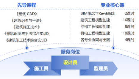《建筑信息模型應(yīng)用》是高職建筑工程技術(shù)專業(yè)一門專業(yè)核課程,是我校首批重點建設(shè)課程。本課程安排在第2學(xué)期,屬于技術(shù)應(yīng)用型課程,同時也是實現(xiàn)教學(xué)與實習(xí)、工作無縫對接的重要一環(huán)。課程重點培養(yǎng)學(xué)生掌握BIM技術(shù),提高學(xué)生在建筑設(shè)計、施工和管理等方面的應(yīng)用能力。本課程在人才培養(yǎng)方案中主要服務(wù)三大就業(yè)崗位之首的設(shè)計員崗,因此在在專業(yè)人才培養(yǎng)體系中具有舉足輕重的地位,如圖1所示。