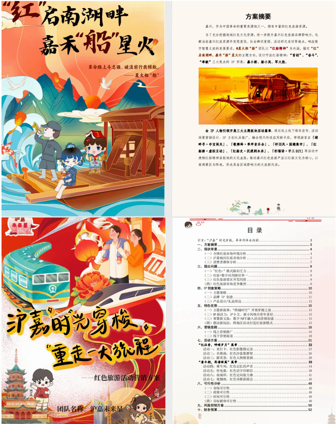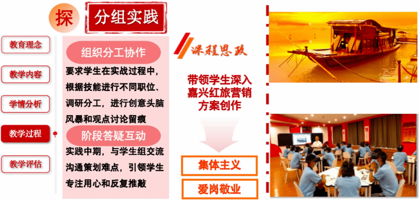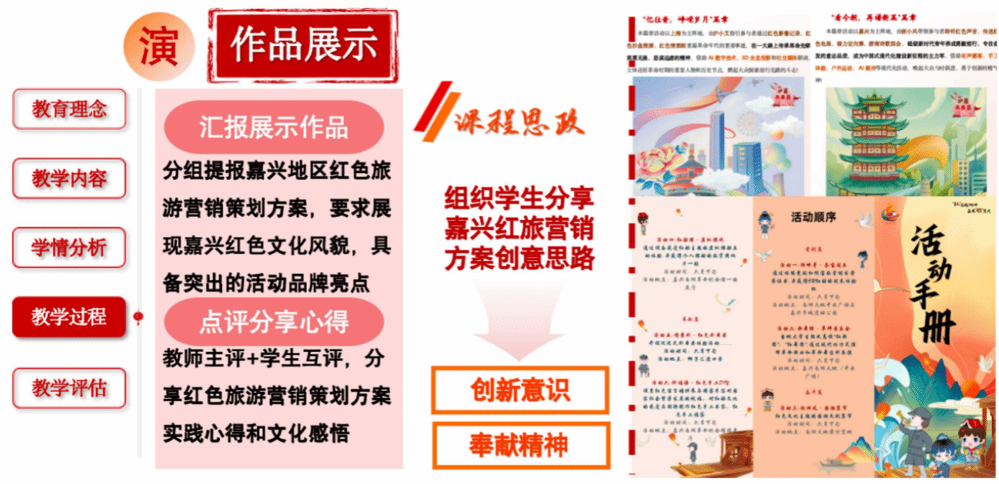 從調(diào)研方法到作品實踐,學(xué)生在首創(chuàng)、奮斗、奉獻精神的鼓舞下從校內(nèi)延伸到校外,積極開展嘉興地區(qū)紅旅營銷策劃方案作品打磨,團結(jié)協(xié)作進行全流程專業(yè)實踐,展現(xiàn)了從課程思政到實踐思政的教學(xué)方式轉(zhuǎn)換,從而帶領(lǐng)學(xué)生堅定文化自信、提升技能水平、施展創(chuàng)意才華。