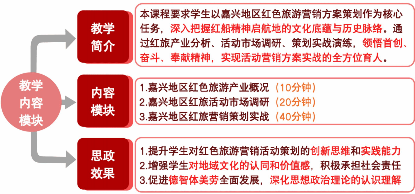 不同于以往泛泛而談的紅色文化和課程思政授課模式,本項目作為地域文化活動策劃實戰(zhàn)的重要模塊,聚焦江浙滬(尤以嘉興為中心)地區(qū)的紅色文化歷史和革命精神,讓學(xué)生有相對明確的課程思政學(xué)習(xí)方向,通過一門課程的一個模塊深度把握地區(qū)紅旅文化精髓,以“紅船精神”作為明晰透徹的落腳點,便于學(xué)生系統(tǒng)掌握課程思政的核心內(nèi)涵,避免停滯于淺薄的認知層面。