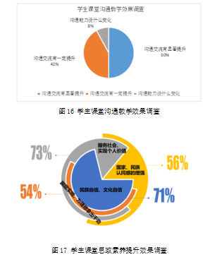通過課內(nèi)外各類形式多樣的活動(dòng)項(xiàng)目的實(shí)施和實(shí)踐,大部分學(xué)生潛在的能力素養(yǎng)得到發(fā)掘和鍛煉,溝通能力提升。百分之70以上的學(xué)生認(rèn)為增加了民族自信與文化自信、服務(wù)意識(shí)和個(gè)人價(jià)值實(shí)現(xiàn)動(dòng)力等課程思政素養(yǎng)。