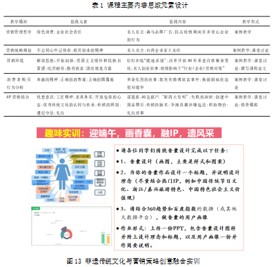 《市場營銷》課程中涉及“文化”的知識(shí)點(diǎn)比較多,包括市場營銷環(huán)境分析中的社會(huì)文化因素和消費(fèi)者行為分析中分析文化因素對(duì)消費(fèi)者行為的影響。教師引導(dǎo)學(xué)生了解中國文化元素諸如絲綢、蘇繡、剪紙、川劇、漢服、青花瓷、武術(shù)、茶、中醫(yī)中藥、旗袍等作為知識(shí)印證小案例;還可結(jié)合當(dāng)前較為火爆的文創(chuàng)產(chǎn)業(yè),安排學(xué)生完成一些融入當(dāng)?shù)匚幕氐臓I銷策劃任務(wù),以此培養(yǎng)學(xué)生的民族自豪感和文化自信,彰顯家國情懷。