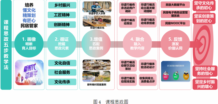 采用課程思政五步教學(xué)法,以培養(yǎng)懂文化、精策劃、有匠心的民宿管家為人才培養(yǎng)目標(biāo),融入鄉(xiāng)村振興的時代背景,以社會服務(wù)、文化傳承為抓手,從專業(yè)特點出發(fā),優(yōu)化實踐教學(xué)體系,匹配真實思政案例和真實工作任務(wù),將其貫穿教學(xué)任務(wù)始終,將課前、課中、課后、線上線下教學(xué)有機(jī)融合,讓學(xué)生走進(jìn)社會,服務(wù)社會,發(fā)揮創(chuàng)新精神,養(yǎng)成文化自信,培養(yǎng)塑造時代工匠。同時結(jié)合課程所教學(xué)評價系統(tǒng)、民宿運營管理平臺,有機(jī)融入文化自信、創(chuàng)意策劃等育人要求培養(yǎng)學(xué)生的堅守文化傳承的初心、堅實創(chuàng)意策劃的匠心、堅持社會服務(wù)的恒心和堅定鄉(xiāng)村振興的雄心,實現(xiàn)潤物無聲的育人效果。