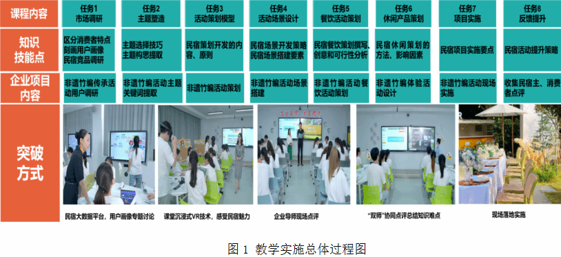 在課堂教學(xué)過程中,將教學(xué)項目分解成子任務(wù)中的知識技能點,對接企業(yè)“非遺竹編傳承活動”項目中的子內(nèi)容,以真實任務(wù)為驅(qū)動,整合校內(nèi)外教學(xué)資源,理實一體,優(yōu)化教學(xué)過程。運用民宿全景VR平臺系統(tǒng),增強(qiáng)學(xué)生對于民宿主題活動開發(fā)全過程的理解;通過仿真實訓(xùn),完成活動開發(fā)和活動策劃等典型工作任務(wù)的訓(xùn)練,提升學(xué)生對民宿策劃的能力;將優(yōu)秀的學(xué)生作品上傳到民宿電子商務(wù)平臺,參與市場轉(zhuǎn)化。校外實訓(xùn)基地的真實體驗,讓學(xué)生感受民宿的工作氛圍,體驗民宿管家的工作內(nèi)涵。